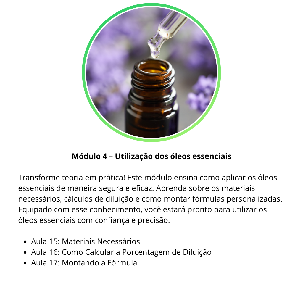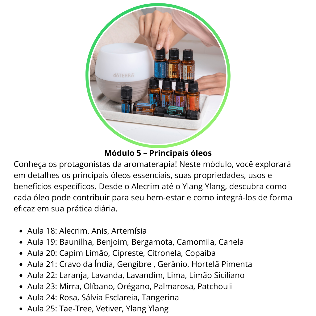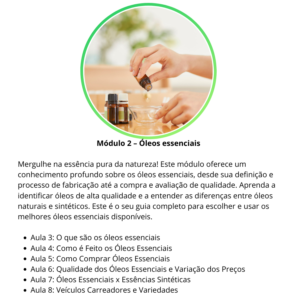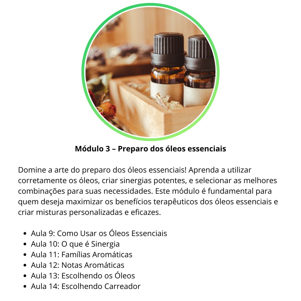 A cada módulo, a cada gota de óleo essencial, você vai sentir, compreender e dominar a arte da Aromaterapia — aprendendo técnicas que podem gerar bem-estar, equilíbrio e até mesmo uma nova fonte de renda.