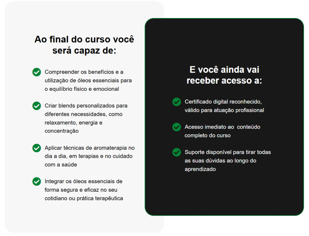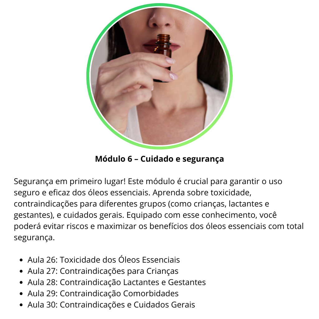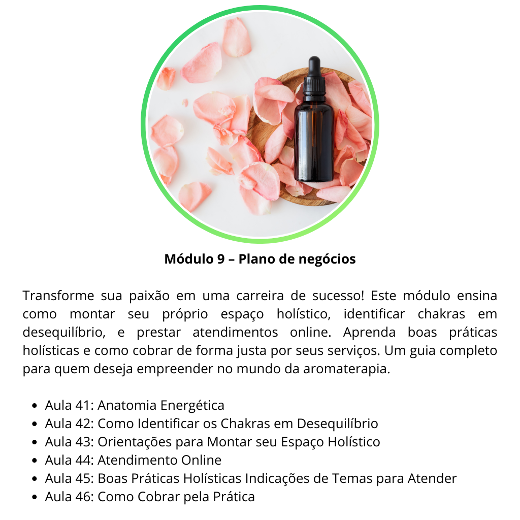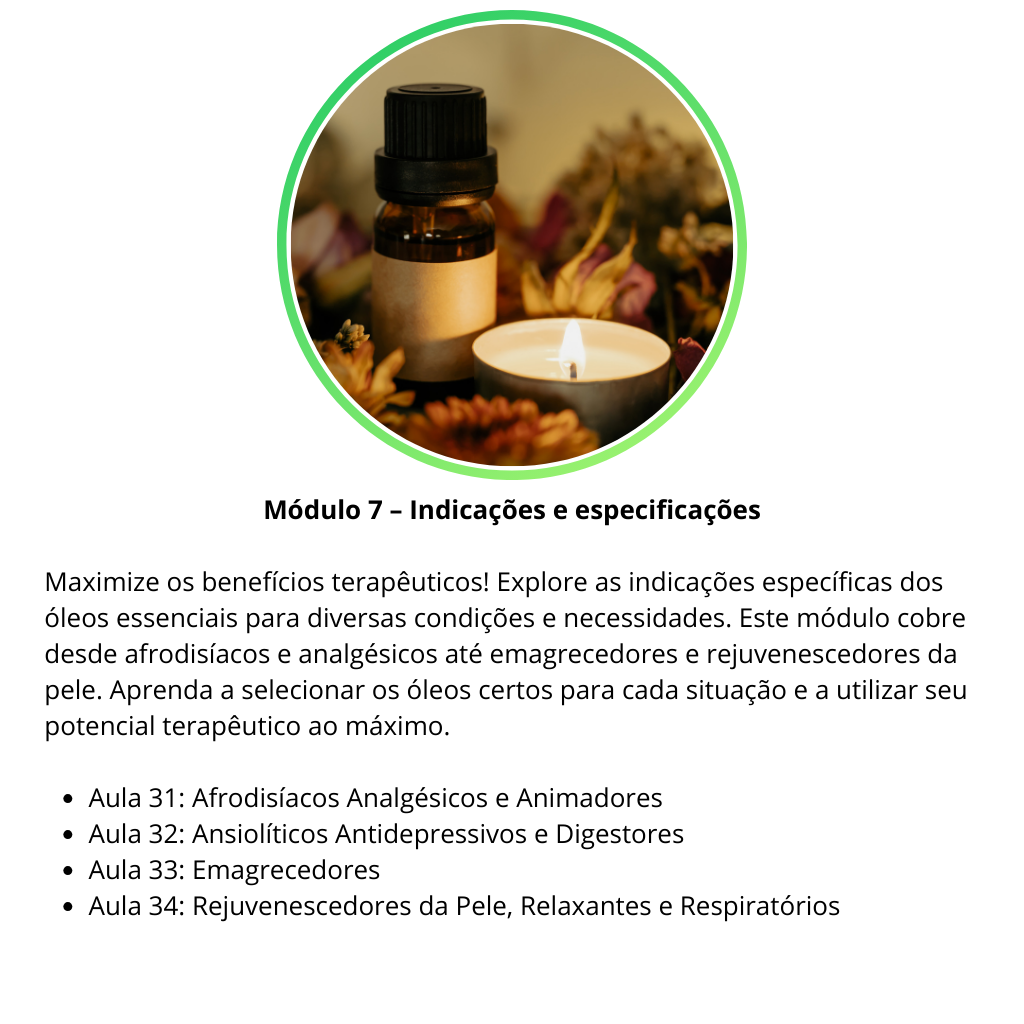 A cada módulo, a cada gota de óleo essencial, você vai sentir, compreender e dominar a arte da Aromaterapia — aprendendo técnicas que podem gerar bem-estar, equilíbrio e até mesmo uma nova fonte de renda.